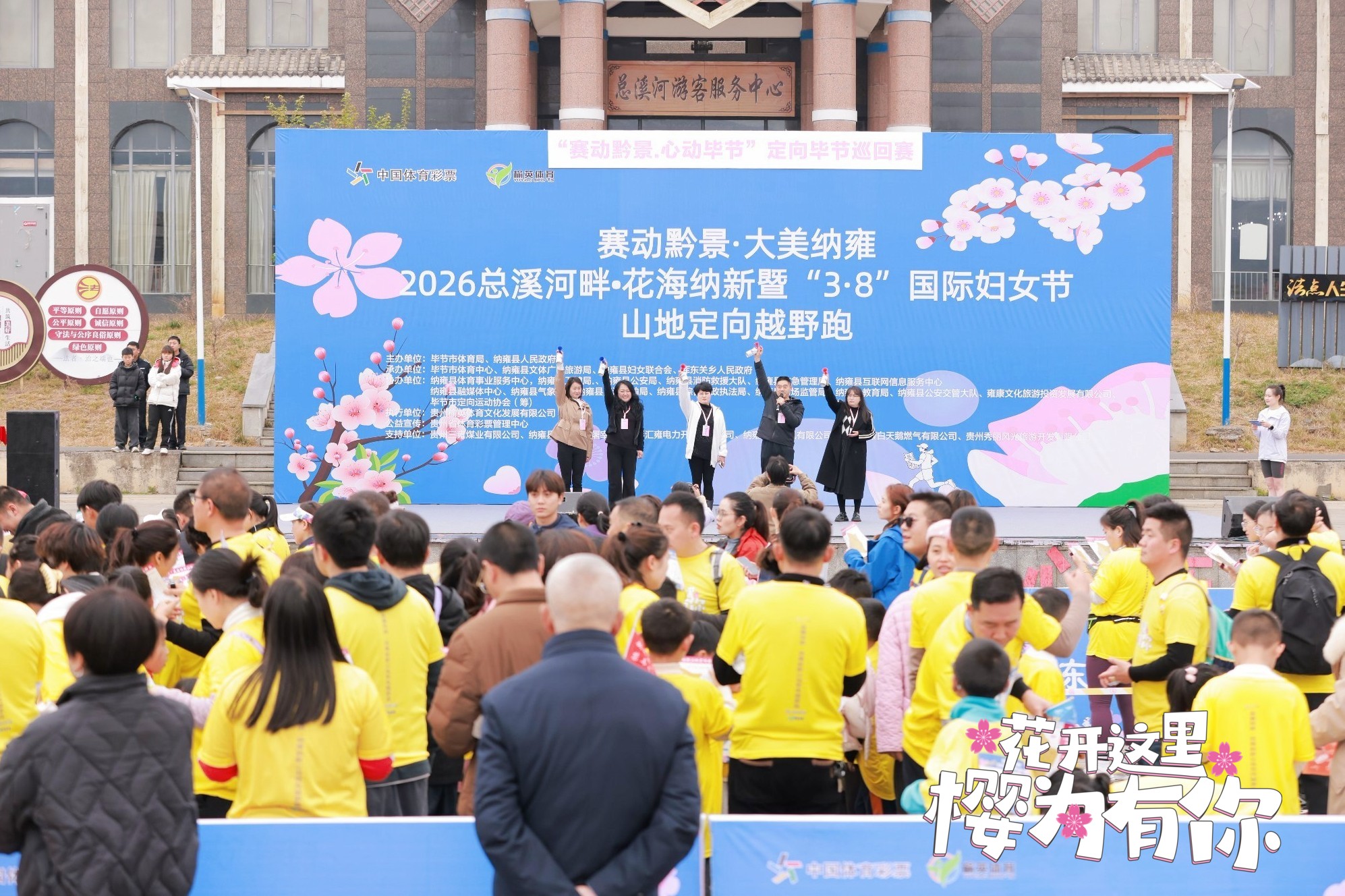 本次赛事由毕节市体育局主办,毕节市体育中心、中共纳雍县委宣传部、纳雍县文体广电旅游局联合承办,以 “执图寻春、樱你而动”为主题,设置公开男子组、公开女子组和亲子组三大组别,紧扣全民健身、家庭参与的办赛核心,吸引了不同年龄段的定向运动爱好者参与。赛事开幕式于当日13时30分在总溪河景区广场举行,毕节市体育中心主任杨建廷、纳雍县人民政府党组成员罗春燕等领导嘉宾出席,龚黎莉局长致欢迎辞,运动员与裁判员代表分别宣誓后,赛事正式鸣笛开跑。